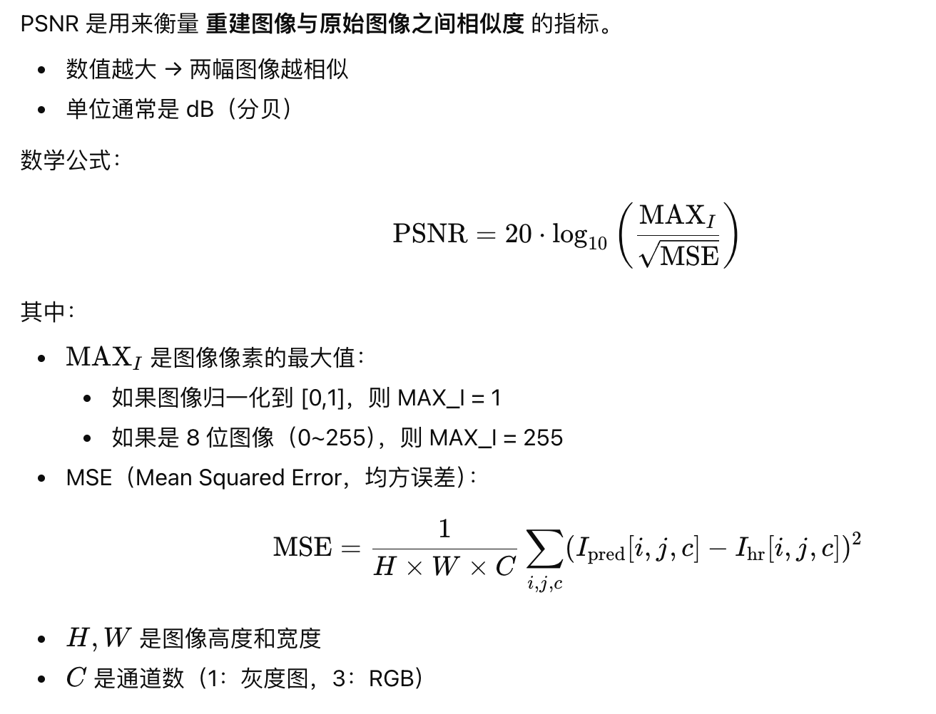def calc_psnr(sr, hr, shave_border=0):# TODO: 实现 PSNR 计算raise NotImplementedError# ============================