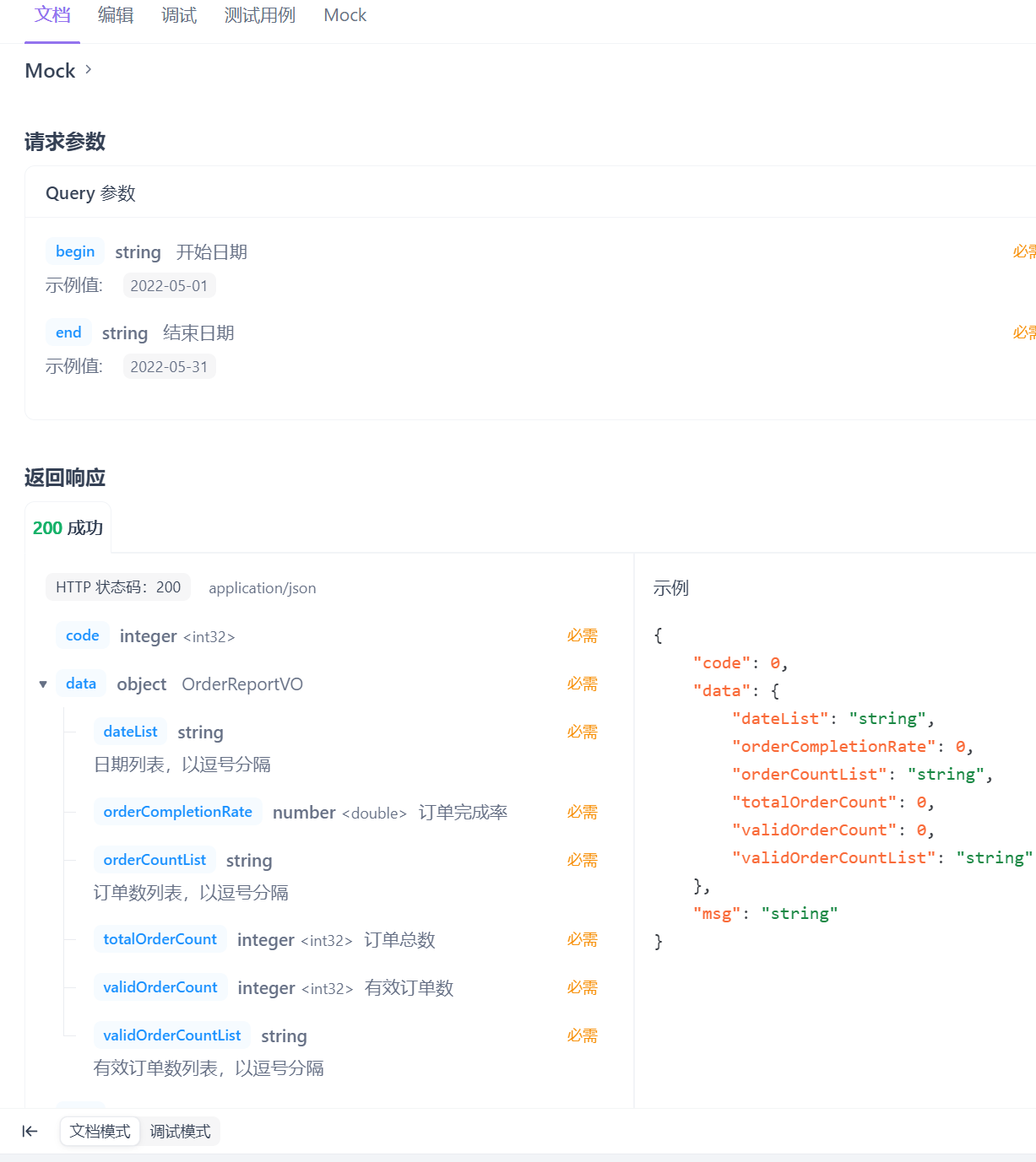可以看到请求参数是开始和结束的日期,用的Query参数,要求我们返回一个OrderReportVO即可,所以我们的主要任务还是在持久层查询响应的属性,值得注意的是这几个属性都是String类型的,需要我们用逗号分隔拼接成一个长字符串。