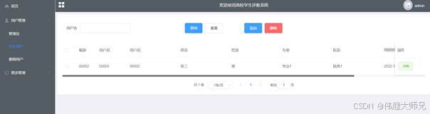 用户管理:通过列表可以获取昵称、用户名、学生姓名、学生性别、学生学号、学校名称、专业名称等信息,进行修改或删除操作,如图5-8所示。