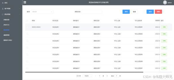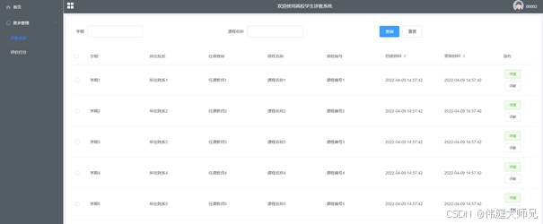 评教信息:通过列表可以获取学期、所在院系、任课教师、课程名称、课程编号等进行详情、修改等操作,如图5-2所示。