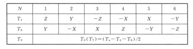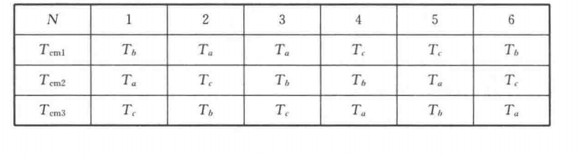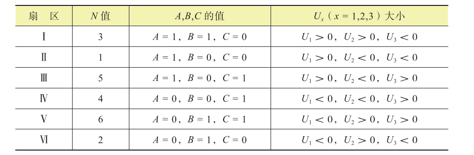 为了继续简化计算,我们规定:若U>0,则A=1,否则A=0;若U>0,则B=1,否则B=0;若U>0,则C=1,否则C=0。因此,A、B、C共有8种组合。但是,由表4.2可知,扇区计算中不存在A、B、C全是0或者全是1的状态,因此有效的4、B、C组合一共有6种。令N=A+2B+4C,通过A、B、C的不同组合计算出N值,可以很方便地判断矢量所处的扇区。表列出了N值与矢量所在扇区的对应关系。