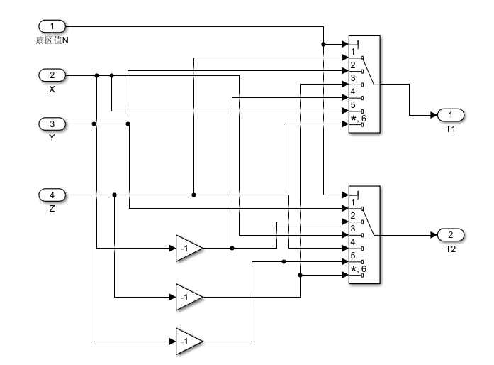 这是一个用于 SVPWM(空间矢量脉宽调制)中,根据扇区编号 N 和 αβ 平面电压矢量分量 X、Y,计算两个基本电压矢量作用时间 T1 和 T2 的模块。