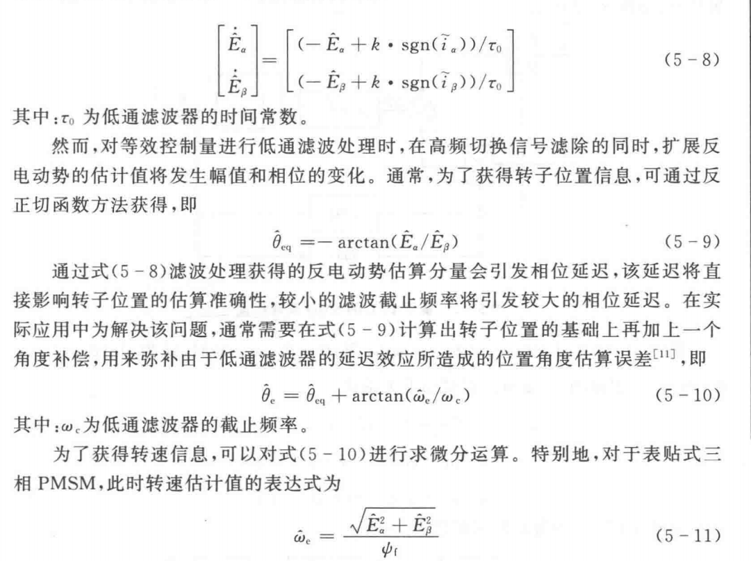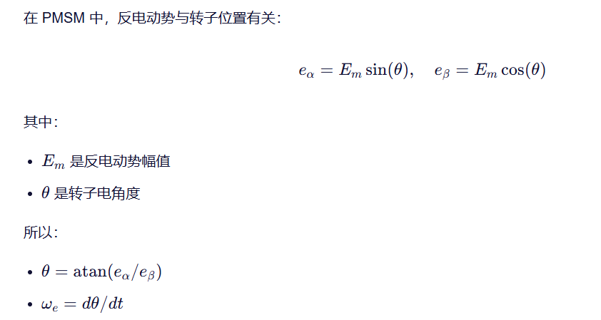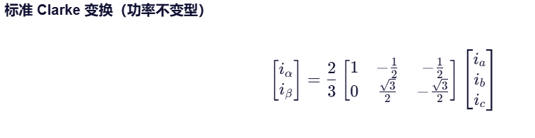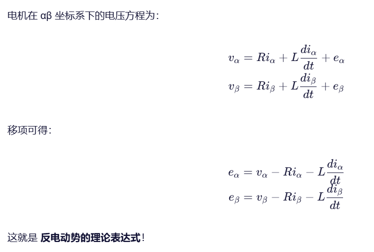 // ==================== 电流值更新 ====================// 滑模观测器部分:如果没有检测到编码器反馈,则使用滑模观测器估计值Angle_SMOPare.Ialpha = current_s.Ialfa; // 使用实际的α轴电流值Angle_SMOPare.Ibeta = current_s.Ibeta; // 使用实际的β轴电流值// ==================== 电压值转换 ====================// 将PWM占空比电压转换为实际的电压值,d轴和q轴电压值需要转换// 使用DCBUSVALUE(直流母线电压)和PWM_PERIOD(PWM周期),1.73205f是sqrt(3),用于将线电压转换为相电压Angle_SMOPare.Valpha = (float)epwm_s.Ualfa * DCBUSVALUE / PWM_PERIOD / 1.73205f; // 转换为实际电压ValphaAngle_SMOPare.Vbeta = (float)epwm_s.Ubeta * DCBUSVALUE / PWM_PERIOD / 1.73205f; // 转换为实际电压Vbeta实际中使用 Clarke计算出来的Iα,Iβ,Uα,Uβ作物观测器的输入。