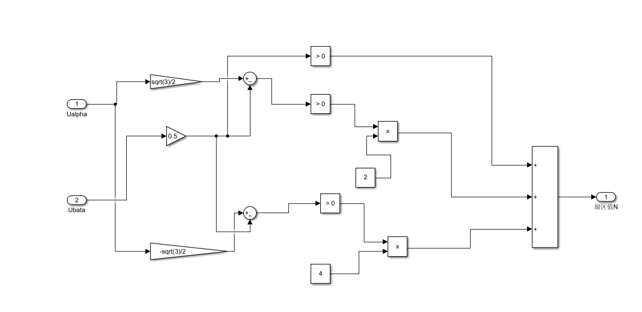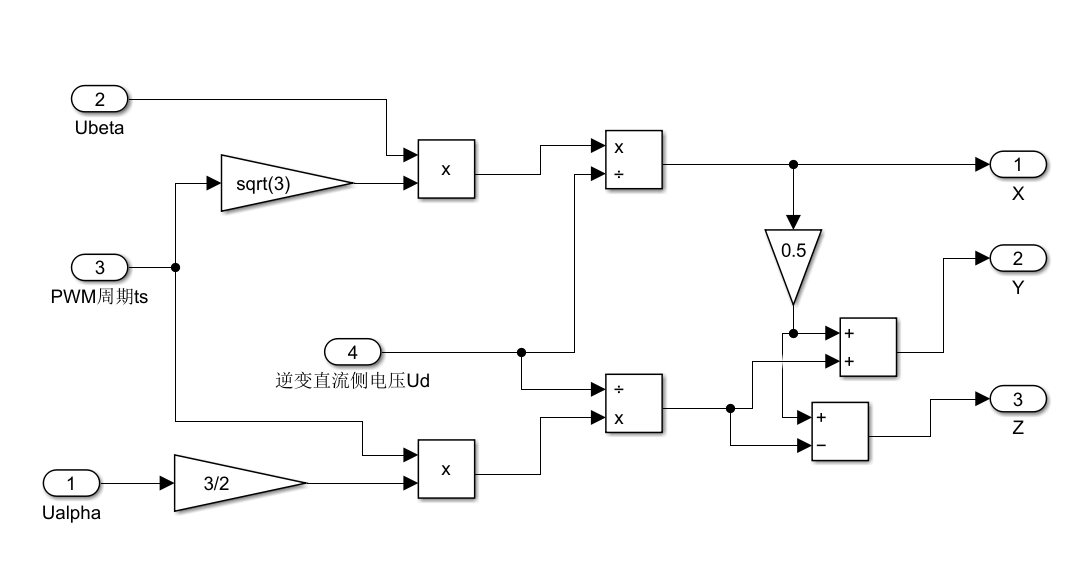 Ualpha:α 轴电压分量Ubata(应为Ubeta):β 轴电压分量PWM周期ts:PWM 调制周期(可能用于后续定时或归一化)逆变直流侧电压Ud:直流母线电压(如 311 V)