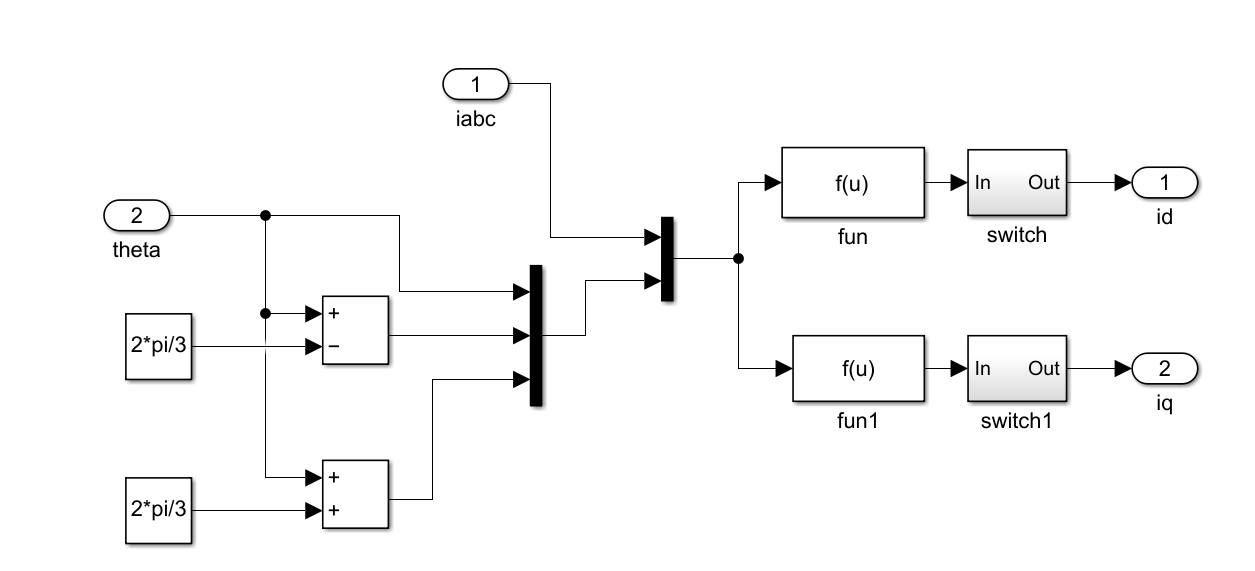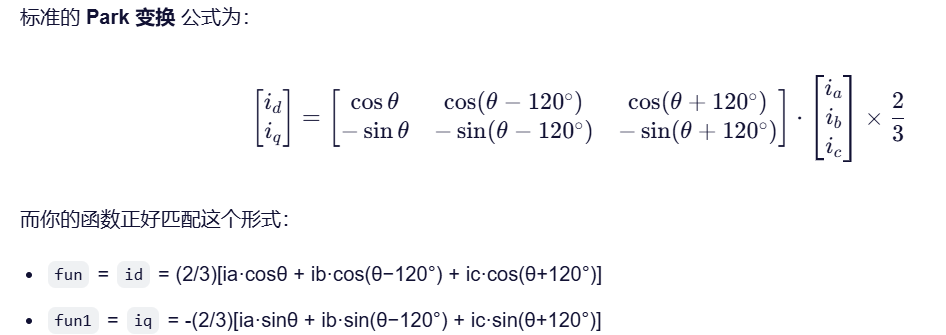 这是一个“三相电流到 dq 坐标系变换”的模块,即 Clarke 变换 + Park 变换的组合,用于电机控制中的矢量变换(坐标变换)