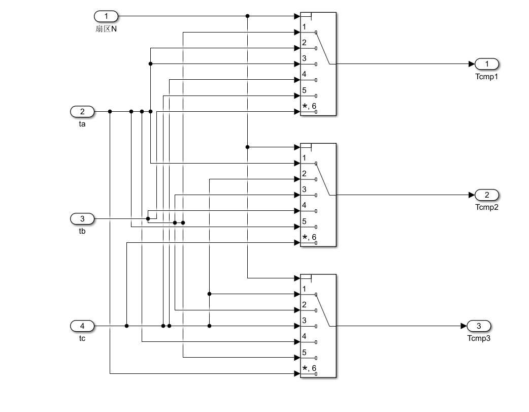 SVPWM 中“确定输出扇区”或“PWM 时序分配”模块,但它并不是用来“判断输入扇区”的,而是根据 已知的扇区 N 和三相 PWM 切换时间 ta、tb、tc,来生成三个中间变量 Tcmp1、Tcmp2、Tcmp3,用于后续的 比较器(Comparator)触发 PWM 波形。
