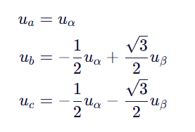 用于将 α-β 坐标系下的两相电压 转换为 三相静止坐标系下的电压(a、b、c 相)。这是电机控制中 SVPWM 或传统 PWM 调制的关键步骤。