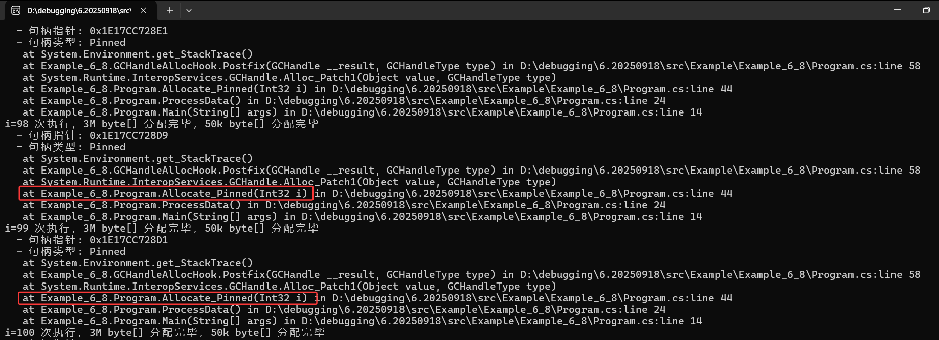 internal class Program{static void Main(string[] args){var harmony = new Harmony("com.example.gchandleallchook");harmony.PatchAll();ProcessData();Console.ReadLine();}static void ProcessData(){for (int i = 1; i <= 1000; i++){Allocate_Bytes(i);Allocate_Pinned(i);Console.WriteLine($"i={i} 次执行,3M byte[] 分配完毕,50k byte[] 分配完毕");}GC.Collect();Console.WriteLine("碎片化已形成,已强制执行GC,请观察托管堆!");}static void Allocate_Bytes(int i){//1k * 1024 * 3 = 3M (1个region)for (int j = 0; j < 1024 * 3; j++){var bytes = new byte[1024]; // 分配 3096 个 1k 的 byte[]}}static void Allocate_Pinned(int i){GCHandle.Alloc(new byte[1024 * 50], GCHandleType.Pinned); // 50k 的 pinned byte[]}}[HarmonyPatch(typeof(GCHandle), "Alloc", new Type[] { typeof(object), typeof(GCHandleType) })]public class GCHandleAllocHook{public static void Postfix(GCHandle __result, GCHandleType type){if (type == GCHandleType.Pinned){Console.WriteLine($" - 句柄指针: 0x{GCHandle.ToIntPtr(__result).ToInt64():X}");Console.WriteLine($" - 句柄类型: {type}");Console.WriteLine(Environment.StackTrace);}}}