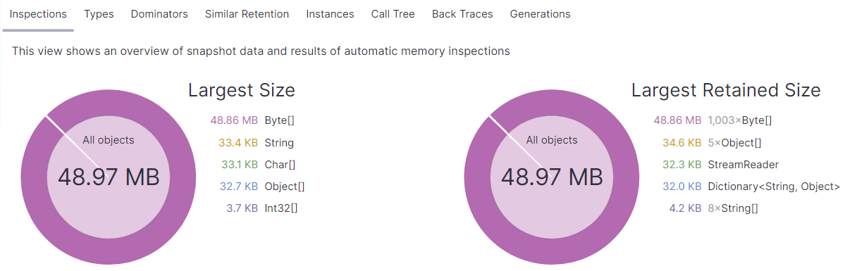 从卦中可以看到,内存总计为 1.9G,其中 gen2 就独吃 1.8G,很显然这是托管内存泄露,接下来的操作就是采一个 snapshot,打开快速检测台,截图如下: