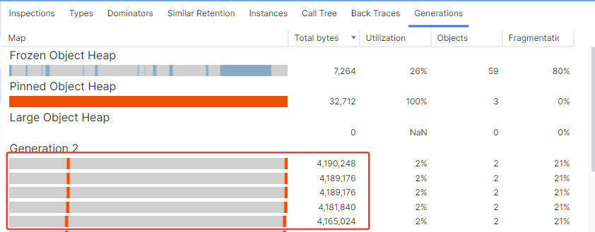 接下来就是要寻找这些 pinned 对象,他们到底是什么,为什么让 GC 痛苦不堪,可以选择 Generations 选项卡,双击其中任一个segment,截图如下:
