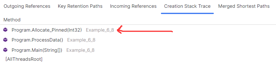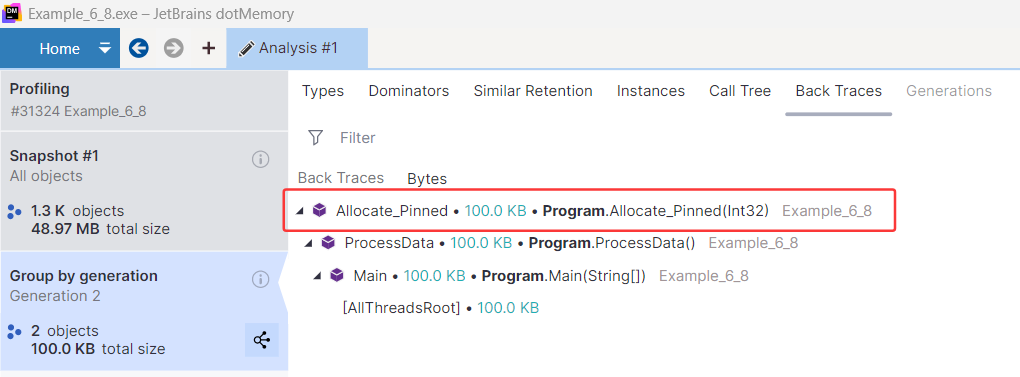 最后选择 Start 按钮开始采集,按照前面所述的方式找到 byte[] 数组再选择 Back Traces 选项卡,可以清楚的看到是 Allocate_Pinned() 方法创建的。
