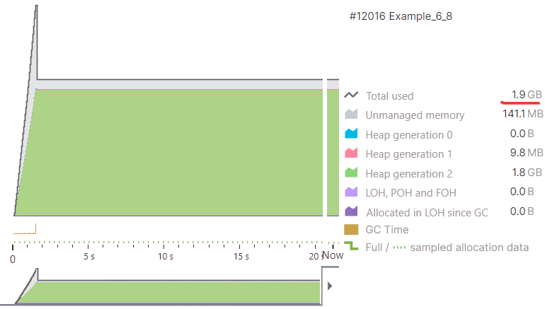 代码有了之后,接下来就是用 dotMemory 把程序给跑起来,内存走势图如下所示。