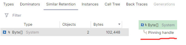 打开面板之后发现都是 Byte[] 数组,通过 Similar retention 选项卡发现都是 Pinning handle ,即通过 GCHandleType.Pinned 固定的,截图如下