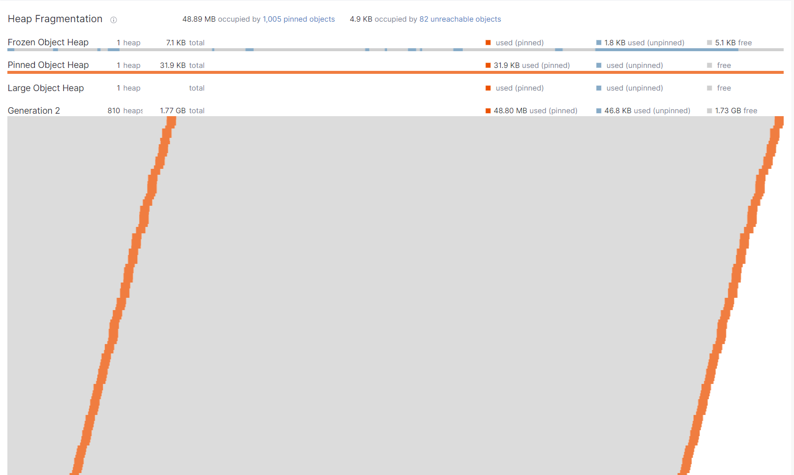 虽然对象占用不大,但内存确确实实被托管堆的gen2所吃,所以必须调转枪头直接观测检测台的尾部 Heap Fragmentation 区域,截图如下: