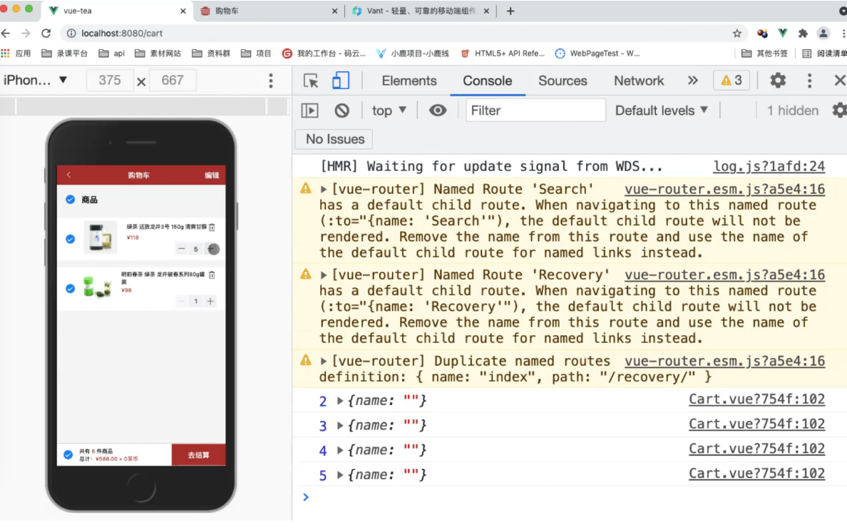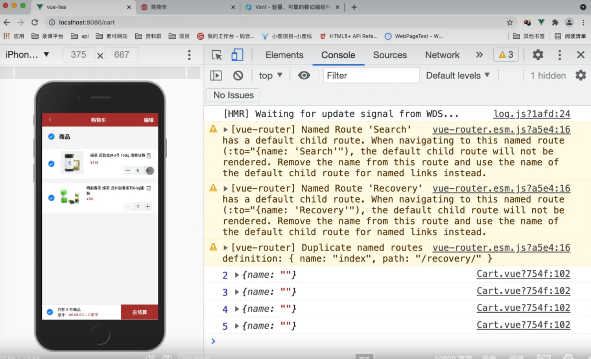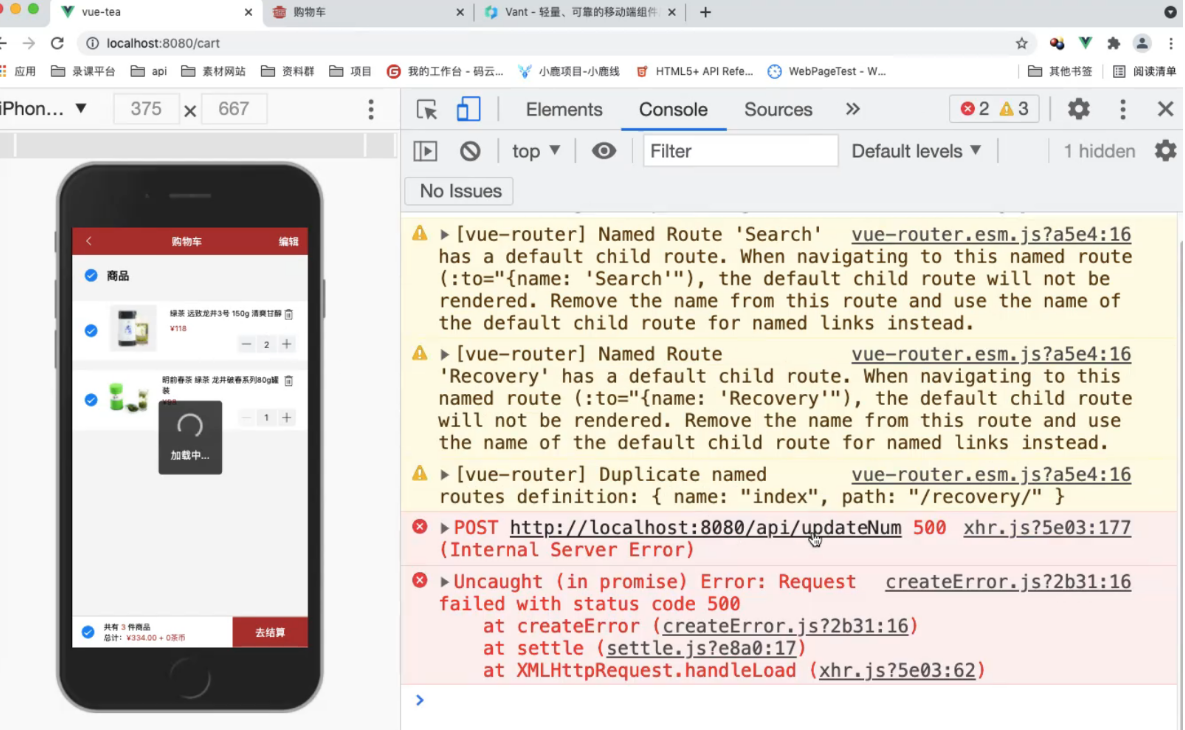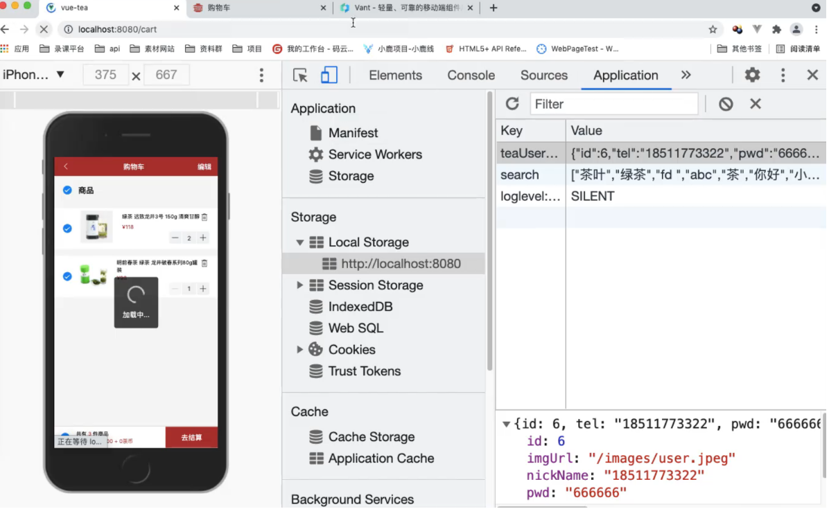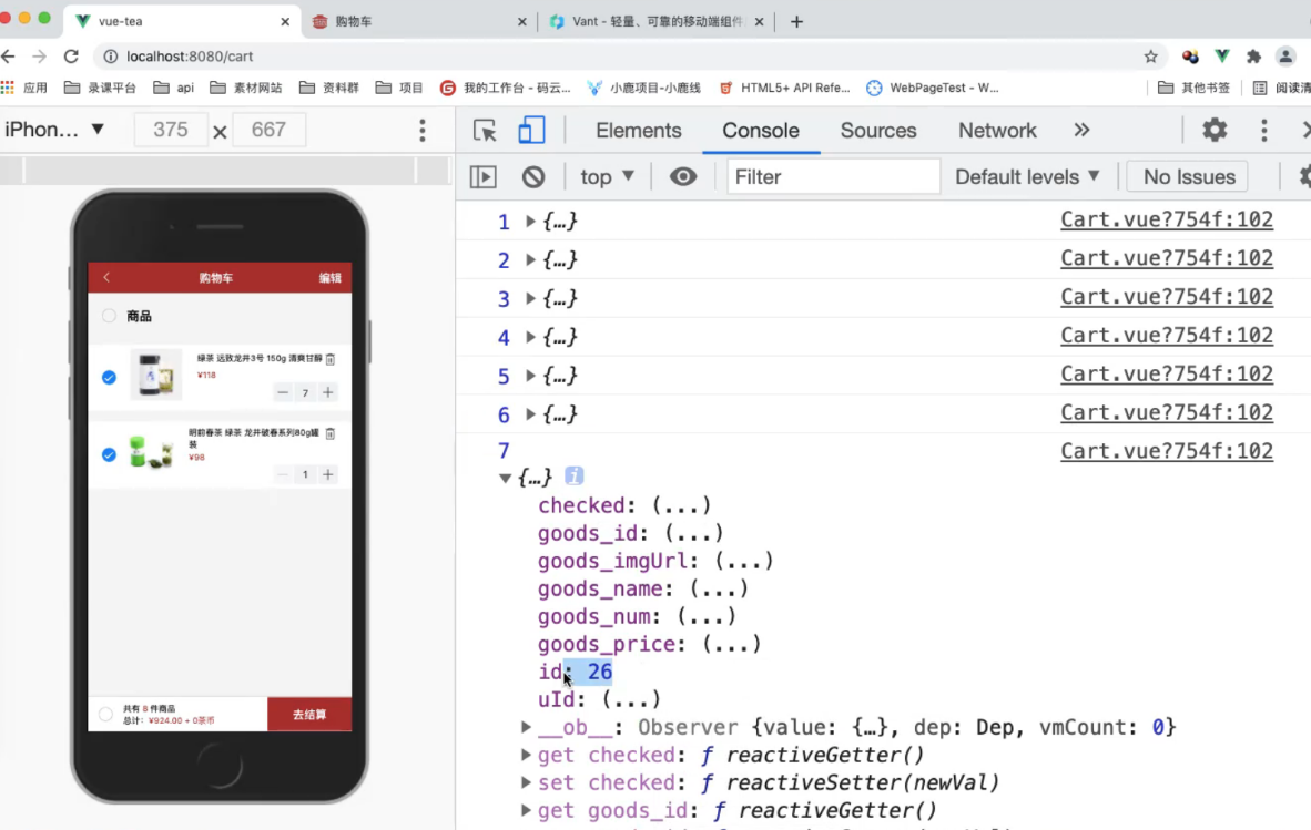 </template><script>import http from '@/common/api/request.js'import {mapState,mapMutations,mapActions,mapGetters} from 'vuex';export default {name: "Cart",data() {return {isNavStatus: false,checked: true}},// 调用 获取 list 的值computed: {...mapState({list: state => state.cart.list}),...mapGetters(['isCheckedAll', 'total'])},created() {// console.log(11);this.getData();},methods: {// 使用这个方法...mapMutations(['cartList', 'checkItem']),...mapActions(['checkAllFn', 'delGoodsFn']),// 前端给后端发送请求,查询某个用户async getData() {// 发送请求let res = await http.$axios({// 前端给后端查询购物车数据接口发送请求url: '/api/selectCart',method: 'POST',// 查询当前用户购物车数据,要带上 tokenheaders: {token: true}});// 循环 前端添加一项 'checked' 因为前端给后端打交道 (交互) // 将数据与结构进行了重构,前端添加了一项 'checked' // 每一个购物车数据都有一个 'checked:true',通过他我们就可以知道他是选中的res.data.forEach(v => {// 每一项加一个 'checked'v['checked'] = true;})// console.log(res.data);this.cartList(res.data);},// 点击编辑||完成isNavBar() {this.isNavStatus = !this.isNavStatus;},// 修改数量changeNum(value, item) {// 发送请求,前端将当前用户的购物车的id以及修改后的数量=>传递给后端// value 就是修改后的数量 item.id 就是购物车商品的id// console.log(value, item.id);// 发送请求 前端将 value 和 item.id 传递给后端http.$axios({// 前端给后端查询购物车数据接口发送请求url: '/api/updateNum',method: 'POST',// 查询当前用户购物车数据,要带上 tokenheaders: {token: true},data: {id: item.id,num: value}}).then(res => {console.log(res);});}}}