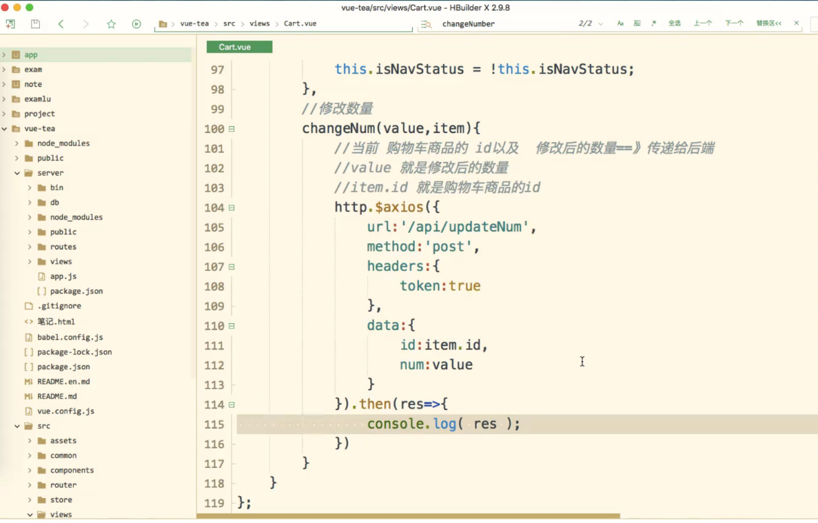 router.post('/api/updateNum', function(req, res, next) {// 获取前端传递的 id和numlet id = req.body.id;let changeNum = req.body.num;// 查询当前商品的 id 号connection.query(`select * from goods_cart where id=${id}`, function(error, results) {// 原来数据库中商品的数量let num = results[0].goods_num;// 修改数据库中商品的数据量connection.query(`update goods_cart set goods_num=replace(goods_num,${num},${changeNum}) where id=${id});`,function(err, result) {// 发送数据res.send({data: {code: 200,success: true// msg: '修改成功'}})})})// console.log(id, num);// res.send({// data: {// a: 1// }// })