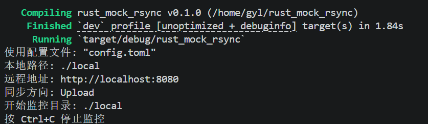 接下来就是启动我们的监听程序:rust_mock_rsync了。该程序有一个配置文件:config.toml,可配置server地址、监听目录等信息。