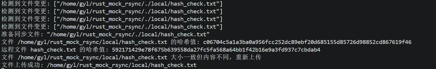 我们创建文件hash_check.txt,并随便写入一些字符。从终端截图可以看到,监控程序检测到文件有变动,进而计算本地文件和远程文件的MD5,发现不一致,进而触发文件同步的上传。