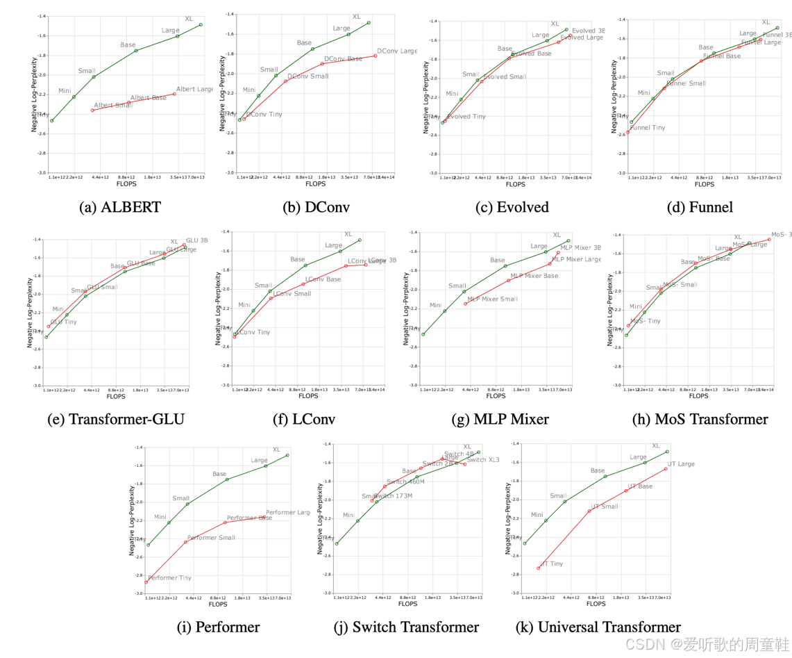 上面左侧图表展示的是 Yi Tay 的论文成果,该研究对比了多种超参数配置与模型架构,如图所示,模型参数量(此处作为计算量的替代指标)与负对数困惑度呈现出完美的线性相关性,这表明无论模型深度、宽度或超参数的具体设置如何变化,真正起决定性作用的只有总计算量投入