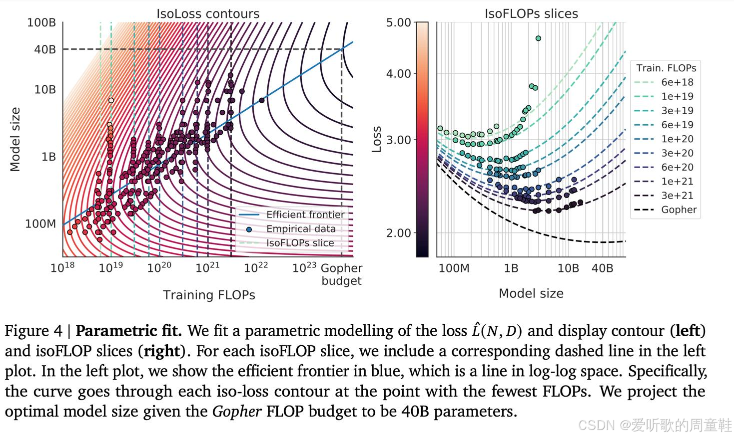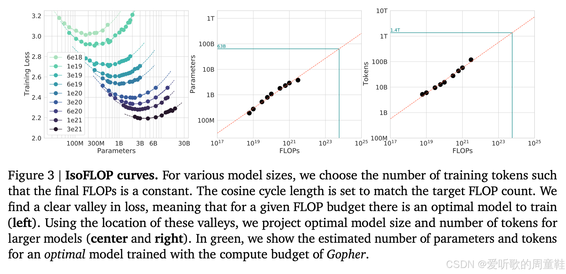 谷歌团队发表的 Chinchilla 论文正是为了通过实证研究,精确确定模型参数量与训练数据量之间的最优配比,在训练浮点运算量最小化的前提下,他们采用了三种不同的方法(图中 Approach 1/2/3)通过拟合不同曲线来进行缩放定律预测,这些蓝色圆点代表他们实际训练的模型,这些趋势线实质上预测了在不同浮点运算量条件下,模型参数规模的最优解