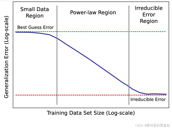 它清晰地揭示了模型性能演变存在三个特征鲜明的区间;最初阶段,模型仅能进行随机猜测,随后进入可预测的缩放区间,这正是幂律主导的区域,最终会进入渐近区间,此时模型性能逐渐逼近该模型类别固有的不可约误差极限。需要特别指出的是,近年来学术界频繁讨论的新型涌现现象,比如所谓的 “能力涌现” 现象,或是算力扩展带来的新特性以及系统架构的关键作用