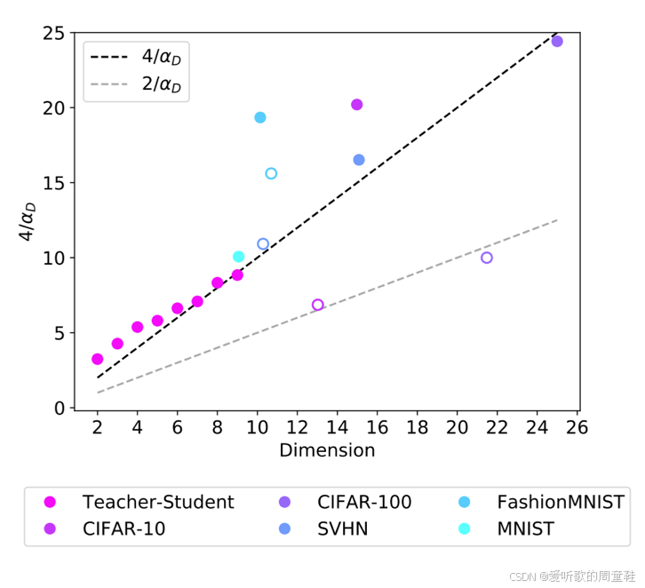 学界对此已有更严谨的理论论证,近期多篇理论与实证研究论文 [Bahri+ 2021] 指出,这些非标准学习速率的出现,实际上与数据的内在维度密切相关: