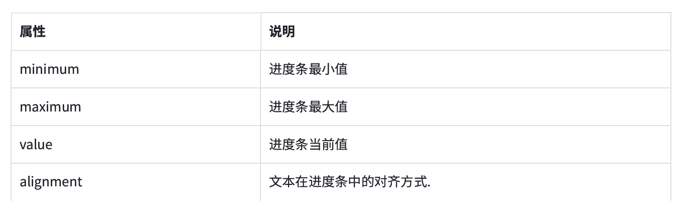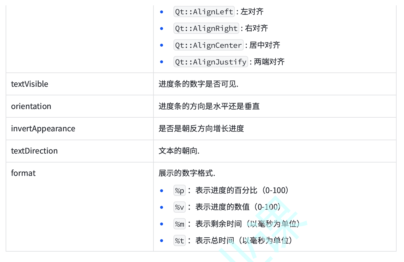 {ui->setupUi(this);//QProgressBar是一个进度条组件//核心属性, 设置这些元素全部都是set+方法名ui->progressBar->setMinimum(10); //设置2进度条最小值ui->progressBar->setMaximum(100); //设置进度条最大值ui->progressBar->setValue(12); //设置当前值qDebug() << ui->progressBar->value(); //获取当前值ui->progressBar->setAlignment(Qt::AlignCenter); //设置文本对齐方式,这里的文本是进度条当前显示的百分比值//对齐方式有4种ui->progressBar->setTextVisible(false); //设置进度条数字是否可见ui->progressBar->setInvertedAppearance(true); //设置是否反向增长ui->progressBar->setOrientation(Qt::Horizontal); //设置进度条的增长方向,Qt::Horizontal是从左往右增长(默认),ui->progressBar->setOrientation(Qt::Vertical); //Qt::Vertical是从下往上增长