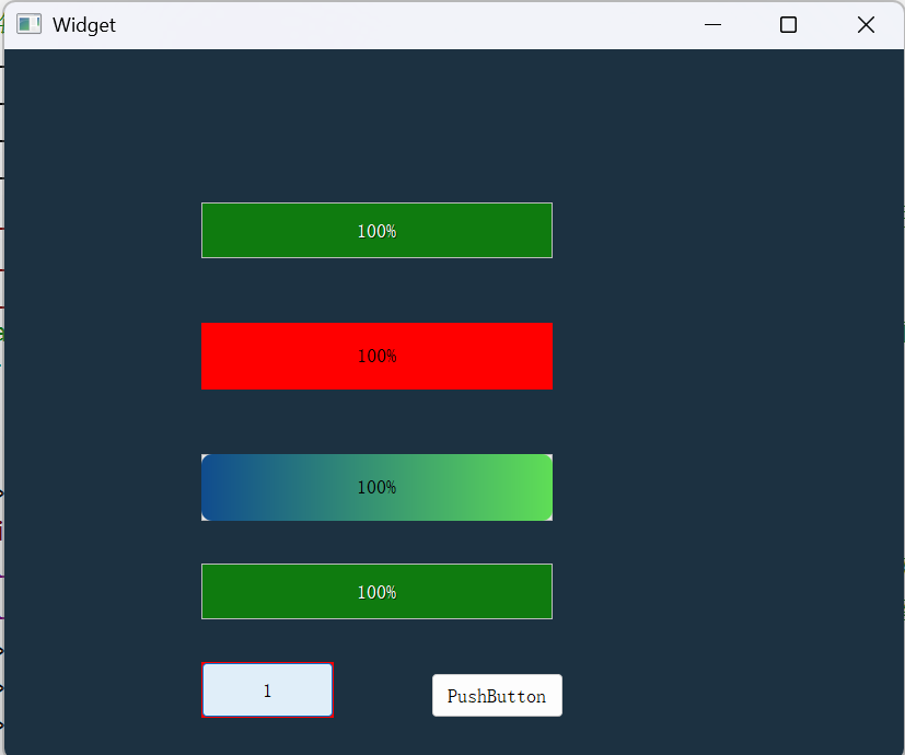 {//Widget窗体的 改变窗体颜色生效this->setStyleSheet("");QPalette p3 = this->palette();p3.setColor(QPalette::Window, QColor("#1C3141"));this->setPalette(p3);ui->progressBar_4->setAutoFillBackground(true);}void Widget::on_pushButton_2_clicked()