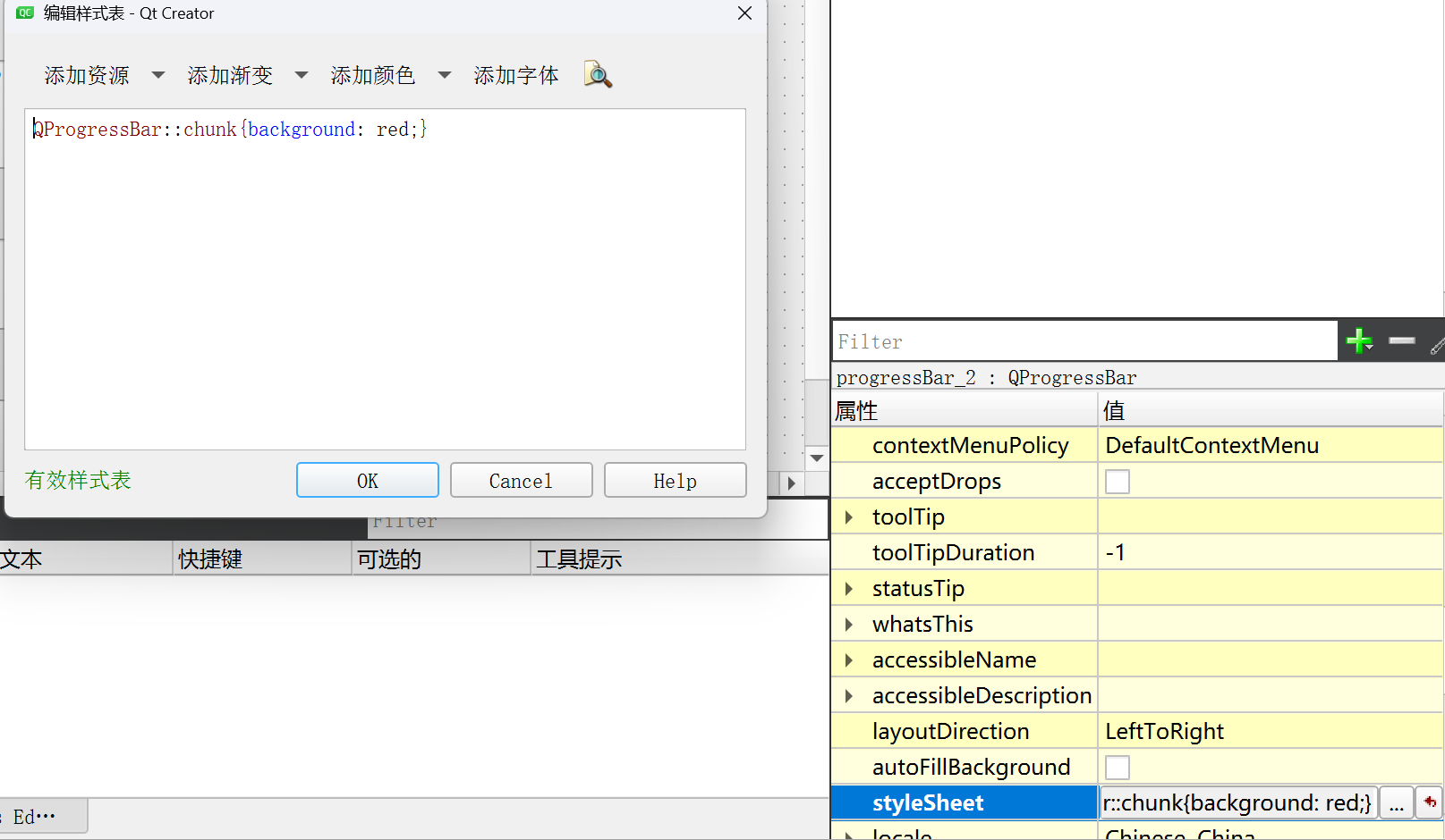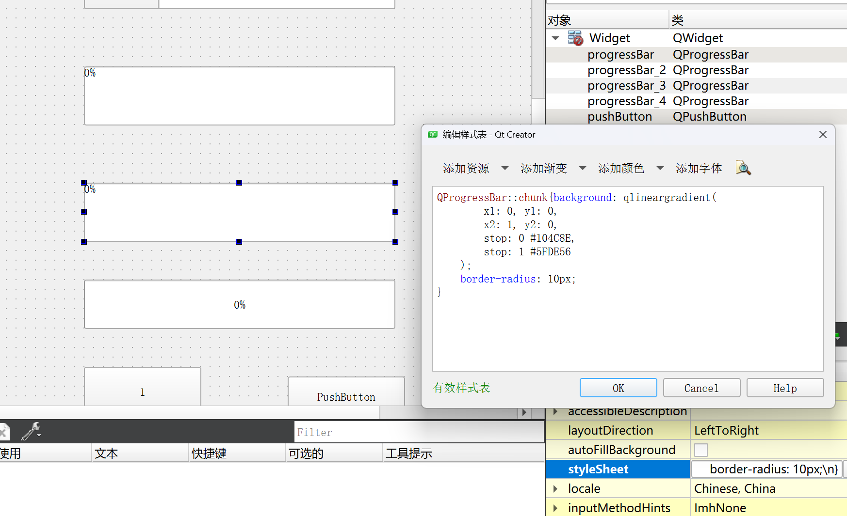 // p.setColor(QPalette::Background, QColor("#FF0000")); // 调整chunk 主色(高亮块)ui->progressBar_4->setPalette(p);ui->progressBar_4->setAutoFillBackground(true);ui->progressBar_4->update();}Widget::~Widget()