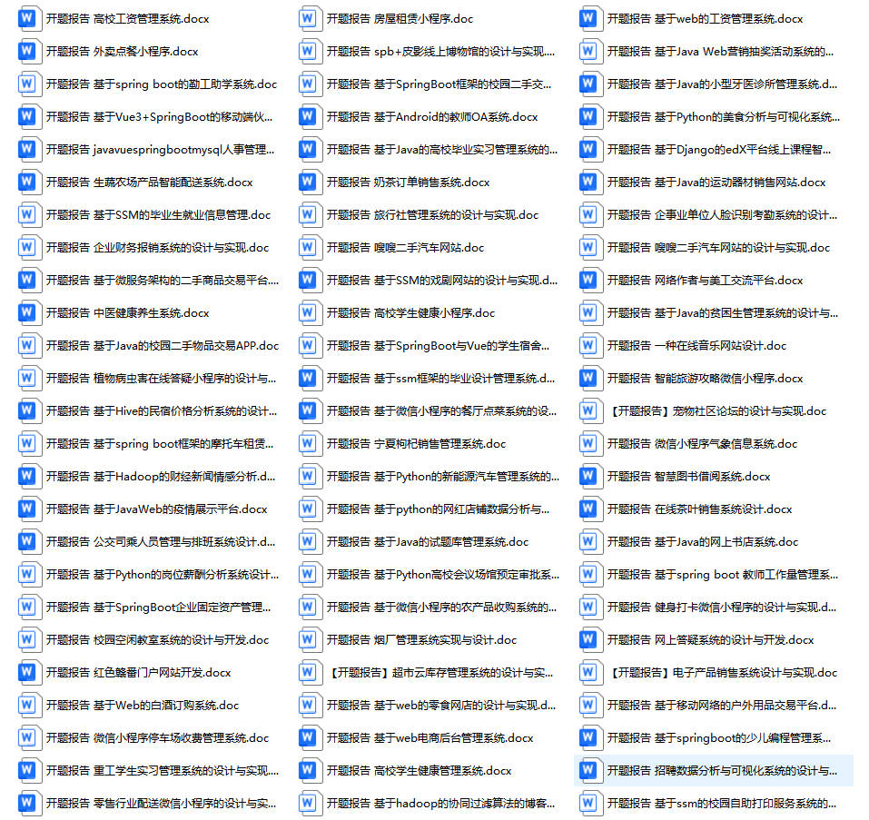 以上是某同学的毕业设计答辩的过程,如果你现在还没有参加答辩,还是开题阶段,已经选好了题目不知道怎么写开题报告,可以下面找找有没有自己符合自己题目的开题报告内容,列表中的开题报告都是往届真实的开题报告,可发送使用或参考。文末或底部来联xi可免费获取
