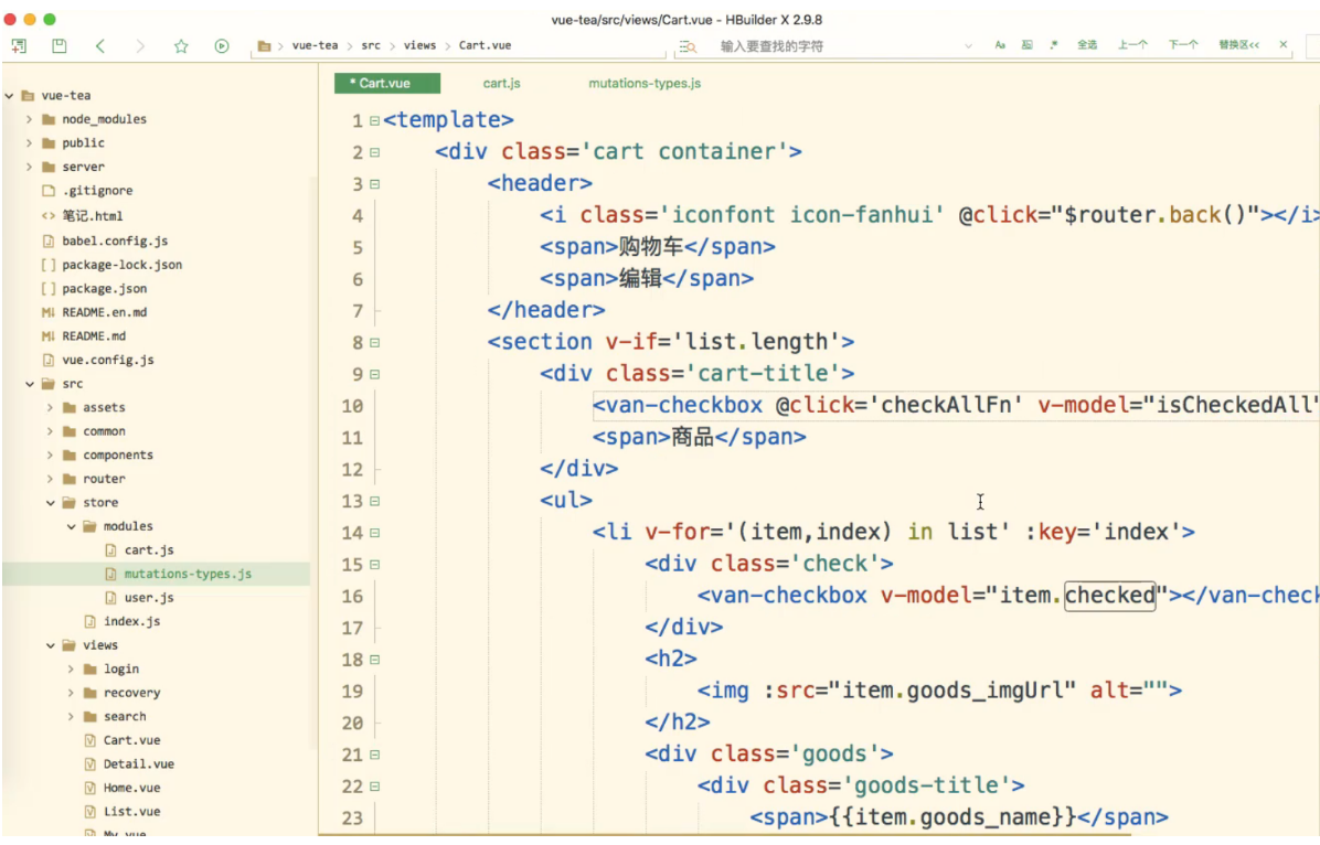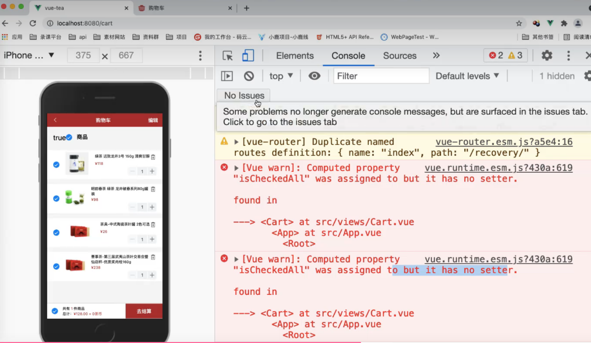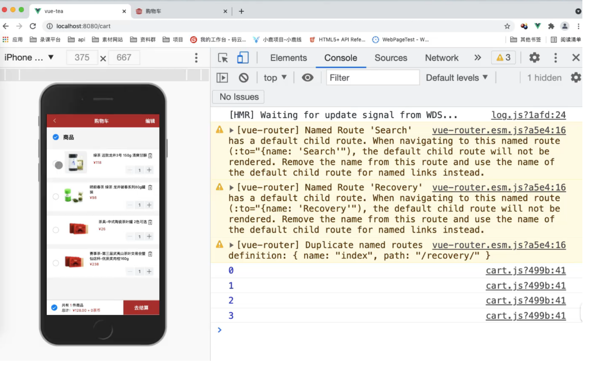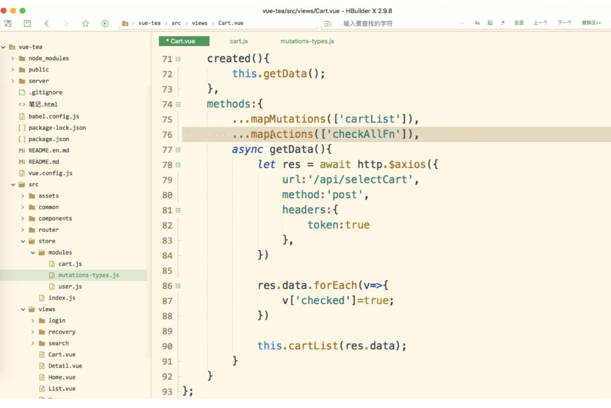 </template><script>import http from '@/common/api/request.js'import {mapState,mapMutations,mapActions,mapGetters} from 'vuex';export default {name: "Cart",data() {return {checked: true}},// 调用 获取 list 的值computed: {...mapState({list: state => state.cart.list}),...mapGetters(['isCheckedAll'])},created() {// console.log(11);this.getData();},methods: {// 使用这个方法...mapMutations(['cartList', 'checkItem']),...mapActions(['checkAllFn']),// 前端给后端发送请求,查询某个用户async getData() {// 发送请求let res = await http.$axios({// 前端给后端查询购物车数据接口发送请求url: '/api/selectCart',method: 'POST',// 查询当前用户购物车数据,要带上 tokenheaders: {token: true}});// 循环 前端添加一项 'checked' 因为前端给后端打交道 (交互) // 将数据与结构进行了重构,前端添加了一项 'checked' // 每一个购物车数据都有一个 'checked:true',通过他我们就可以知道他是选中的res.data.forEach(v => {// 每一项加一个 'checked'v['checked'] = true;})// console.log(res.data);this.cartList(res.data);}}}