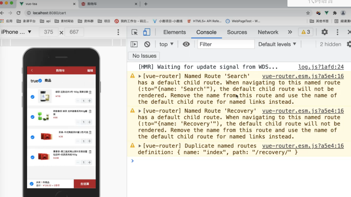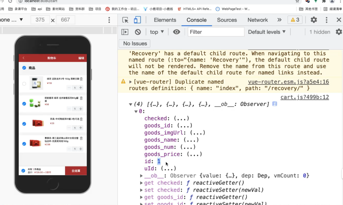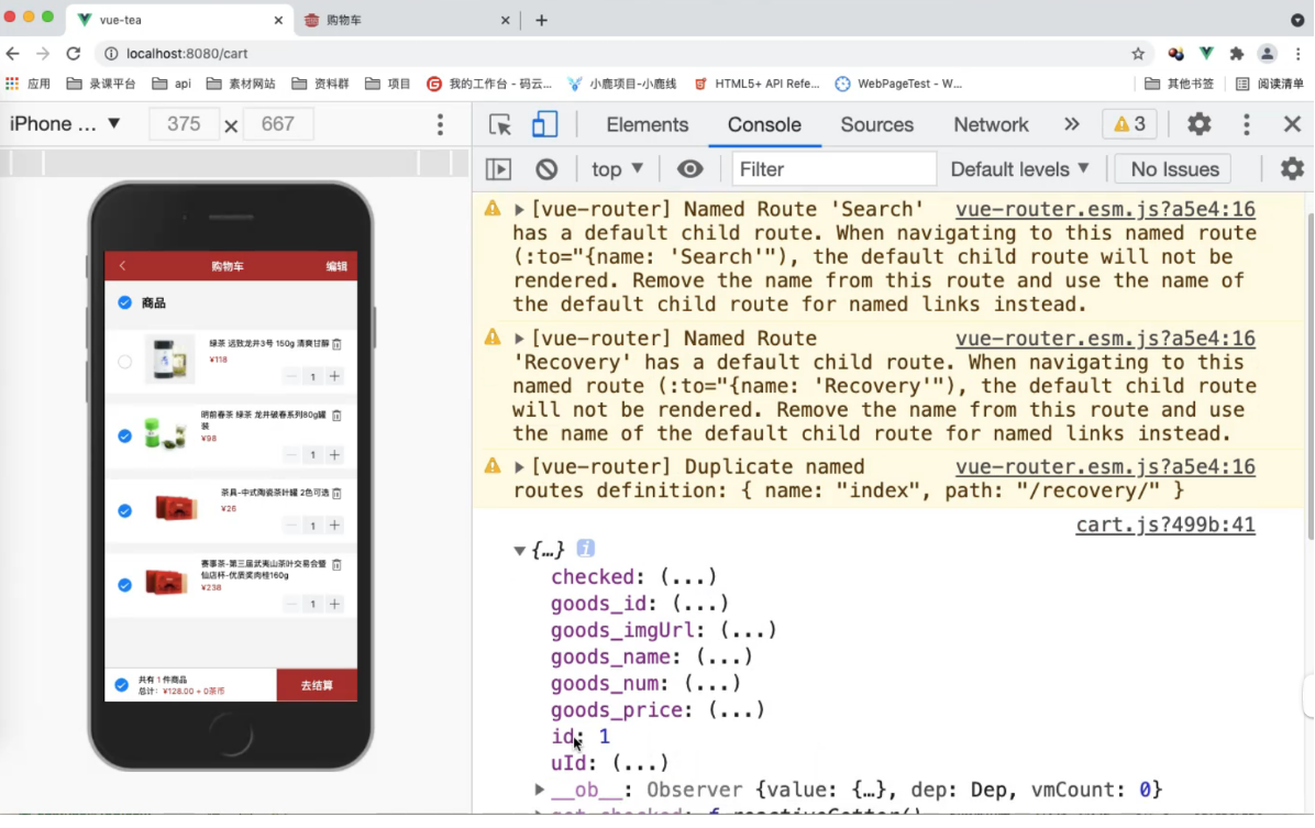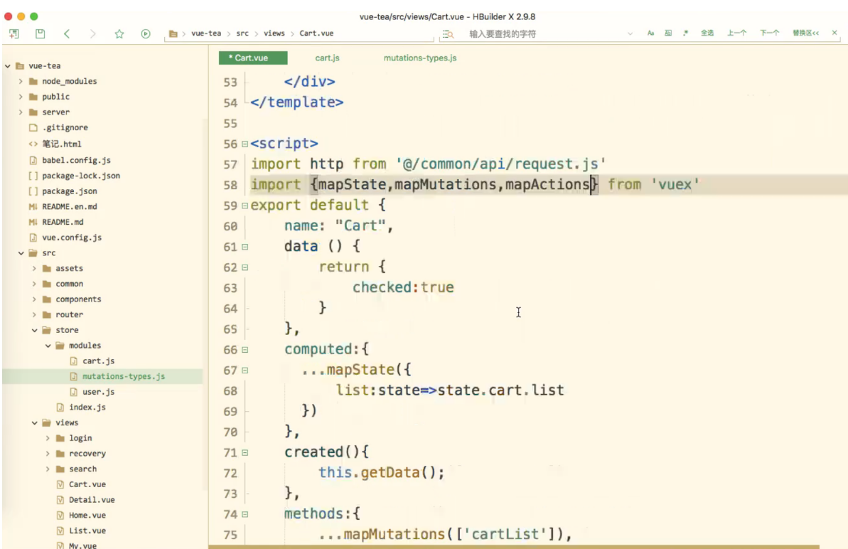 </template><script>import http from '@/common/api/request.js'import {mapState,mapMutations,mapActions,mapGetters} from 'vuex';export default {name: "Cart",data() {return {checked: true}},// 调用 获取 list 的值computed: {...mapState({list: state => state.cart.list}),...mapGetters(['isCheckedAll'])},created() {// console.log(11);this.getData();},methods: {// 使用这个方法...mapMutations(['cartList', 'checkItem']),...mapActions(['checkAllFn']),// 前端给后端发送请求,查询某个用户async getData() {// 发送请求let res = await http.$axios({// 前端给后端查询购物车数据接口发送请求url: '/api/selectCart',method: 'POST',// 查询当前用户购物车数据,要带上 tokenheaders: {token: true}});// 循环 前端添加一项 'checked' 因为前端给后端打交道 (交互) // 将数据与结构进行了重构,前端添加了一项 'checked' // 每一个购物车数据都有一个 'checked:true',通过他我们就可以知道他是选中的res.data.forEach(v => {// 每一项加一个 'checked'v['checked'] = true;})// console.log(res.data);this.cartList(res.data);}}}