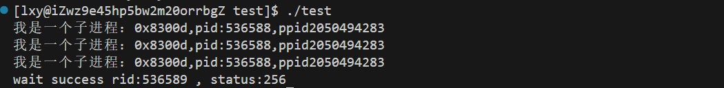 {pid_t id = fork();if (id == 0){int cnt = 3;while (cnt--){printf("我是一个子进程:%p,pid:%d,ppid%d\n", getpid(), getppid());sleep(1);}exit(1);}// 父进程int status = 0;pid_t rid = waitpid(id, &status, 0);if (rid > 0){printf("wait success rid:%d , status:%d\n", rid, status);}else{printf("wait failed :%d:%s\n", errno, strerror(errno));}return 0;