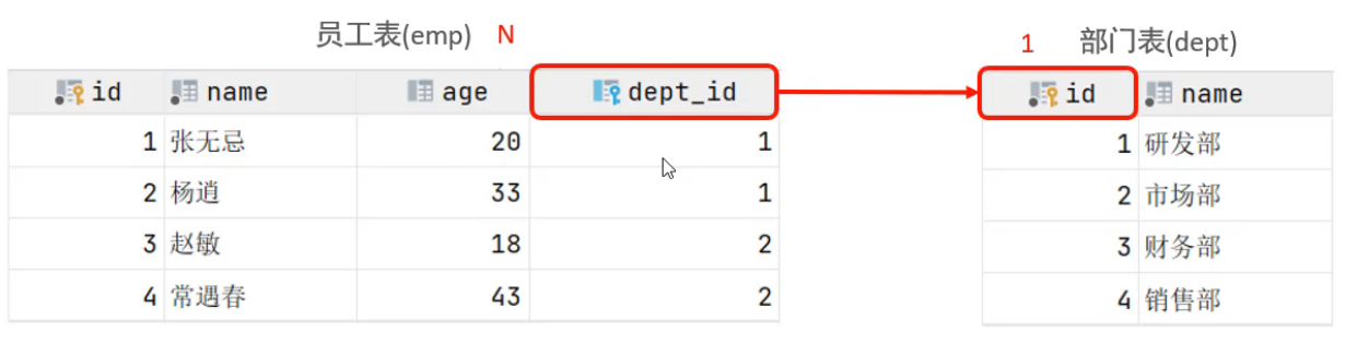- 关系:一个部门对应多个员工,一个员工对应一个部门