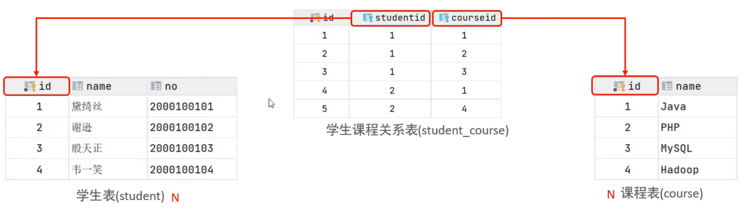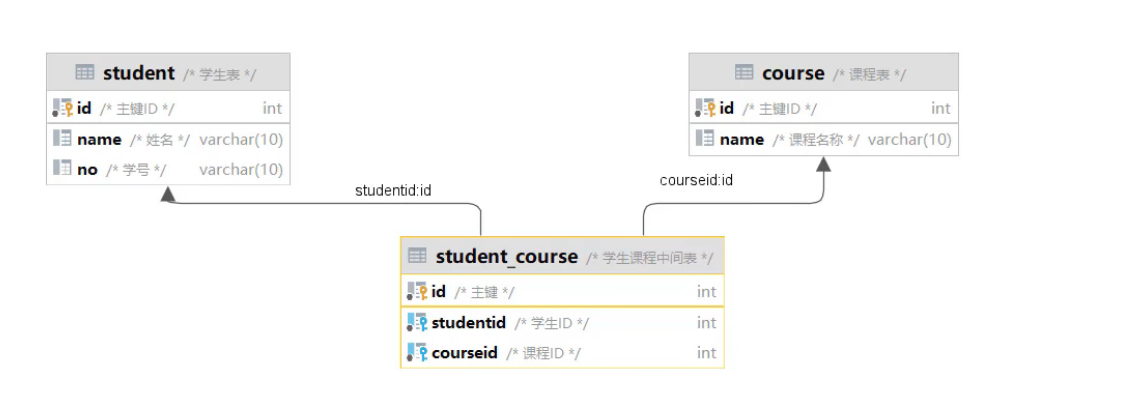 - 实现:建立第三张中间表,中间表至少包含两个外键,分别关联两个主键。