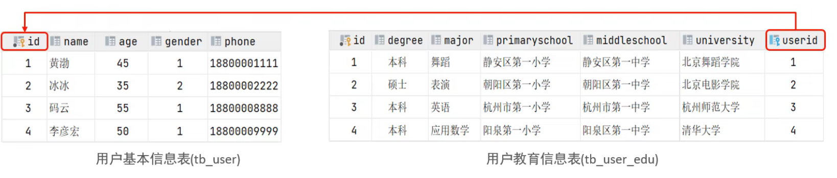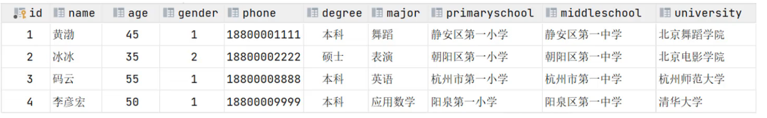 ) COMMENT '用户教育信息表';INSERT INTO tb_user(id, name, age, gender, phone) VALUES(NULL, '黄渤', 45, '1', '18800011111'),(NULL, '冰冰', 35, '2', '18800022222'),(NULL, '马云', 55, '1', '18800088888'),(NULL, '李彦宏', 50, '1', '18800099999');INSERT INTO tb_user_edu(id, degree, major, primaryschool, middleschool, university, userid) VALUES(NULL, '本科', '舞蹈', '静安区第一小学', '静安区第一中学', '北京舞蹈学院', 1),(NULL, '硕士', '表演', '朝阳区第一小学', '朝阳区第一中学', '北京电影学院', 2),(NULL, '本科', '英语', '杭州市第一小学', '杭州市第一中学', '杭州师范大学', 3),(NULL, '本科', '应用数学', '阳泉区第一小学', '阳泉区第一中学', '清华大学', 4);