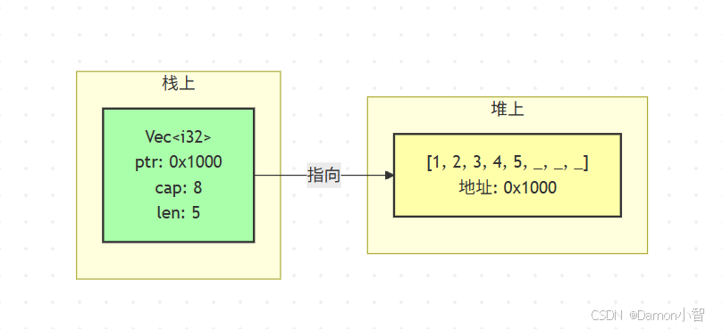 ptr: 0x1, cap: 0, len: 0 // 空 Vec,指针是 dangling