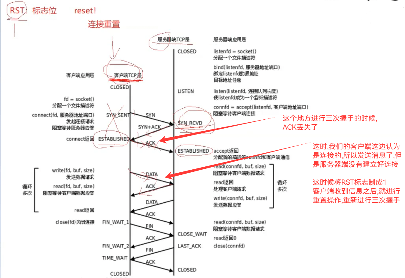 当ACK返回失败了,客户端还进行发送数据了,那么服务器就会收到对应的消息,但是服务器还是没有建立连接的,所以给客户端发送的数据里面会将一些标志位进行设置