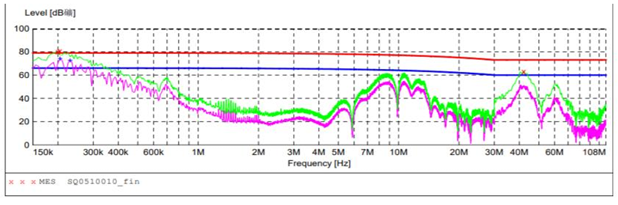 本次案例的主角是一款面向800V平台的高压BMS产品。在其研发验证阶段,进行高压电压法的传导发射测试时,发现低频段(150kHz - 30MHz范围的低端)存在明确超标现象。具体来说,超标频点主要集中在200kHz附近,其干扰电平超过了标准规定的限值线。