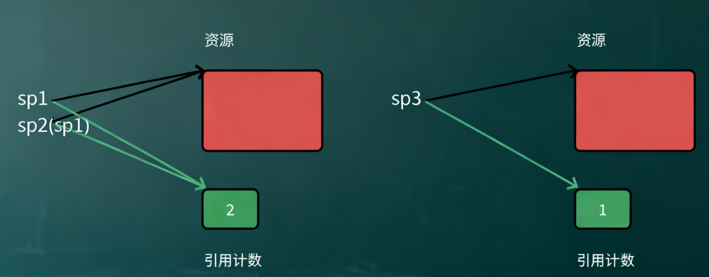 {auto_ptr<Date> ap1(new Date);ap1->_year++;auto_ptr<Date> ap2(ap1);//ap1->_day++; 报错这里的ap1已经是空的了(管理权转移,被拷贝对象悬空)ap2->_month++;unique_ptr<Date> up1(new Date);//unique_ptr<Date> up2(up1);// 禁止拷贝// 可以移动unique_ptr<Date> up2(move(up1));// 可以拷贝可以引动,底层通过引用计数实现shared_ptr<Date> sp1(new Date);shared_ptr<Date> sp2(sp1);cout << sp1.use_count() << endl;cout << sp2.use_count() << endl;// 移动会导致sp1管理的资源被转移,sp1悬空shared_ptr<Date> sp3(move(sp1));cout << sp1 << endl;cout << sp2 << endl;cout << sp3 << endl;if (!sp1)cout << "sp1空" << endl;if (sp2){sp2.reset(); // sp2不再管理,手动释放,但是有其他对象管理的话,就是引用计数减减}Date* ptr = sp3.get();cout << ptr << endl;int* p = new int(10);shared_ptr<int> a(new int(20));shared_ptr<int> b(a, p);cout << a.use_count() << endl;cout << b.use_count() << endl;return 0;