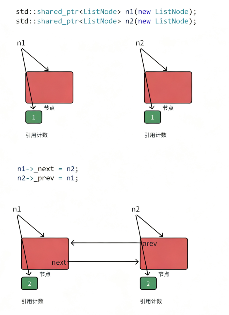 {shared_ptr<ListNode> n1(new ListNode(1));shared_ptr<ListNode> n2(new ListNode(2));cout << n1.use_count() << endl;cout << n2.use_count() << endl;n1->_next = n2;n2->_prev = n1;cout << n1.use_count() << endl;cout << n2.use_count() << endl;// weak_ptr 不⽀持管理资源,不⽀持 RAII// weak_ptr 是专⻔绑定 shared_ptr ,不增加他的引⽤计数,作为⼀些场景的辅助管理 // std::weak_ptr wp(new ListNode);return 0;