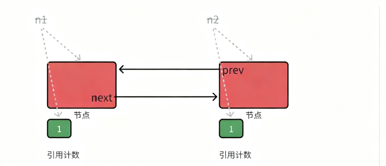 • 如下图所述场景,n1和n2析构后,管理两个节点的引用计数减到1