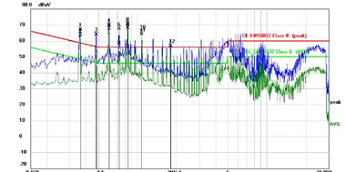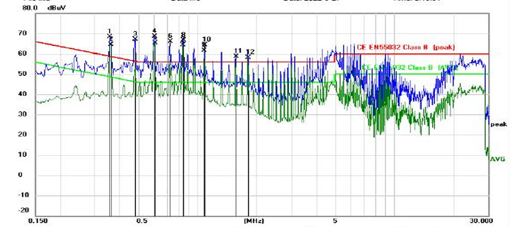 在产品上市前的EMC认证测试中,传导骚扰项目出现了严重超标问题。从测试数据可以看出: