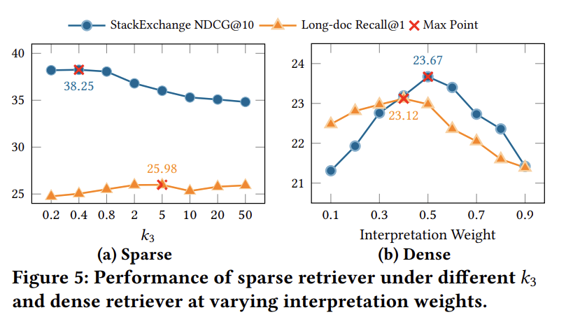 其中,参数 k3k_3k3 控制查询侧词频的影响,这在处理长且推理密集型查询时特别重要。较小的 k3k_3k3 会放大重复关键词的效果,使检索器对核心词汇线索更敏感,而较大的 k3k_3k3 则减少饱和,有利于更广泛的词汇覆盖。