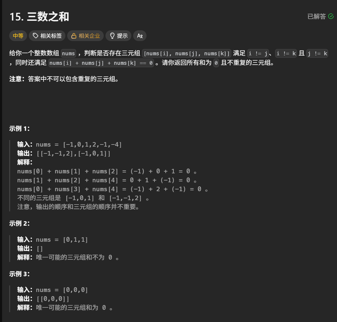 要解决这道题,我们可以采用排序 + 双指针的方法:该问题要求找出所有和为 0 且不重复的三元组。核心思路是将“三数之和”转化为固定一个值之后的“两数之和”,利用排序和双指针来高效解决,同时处理重复元素以满足“不重复”的要求。