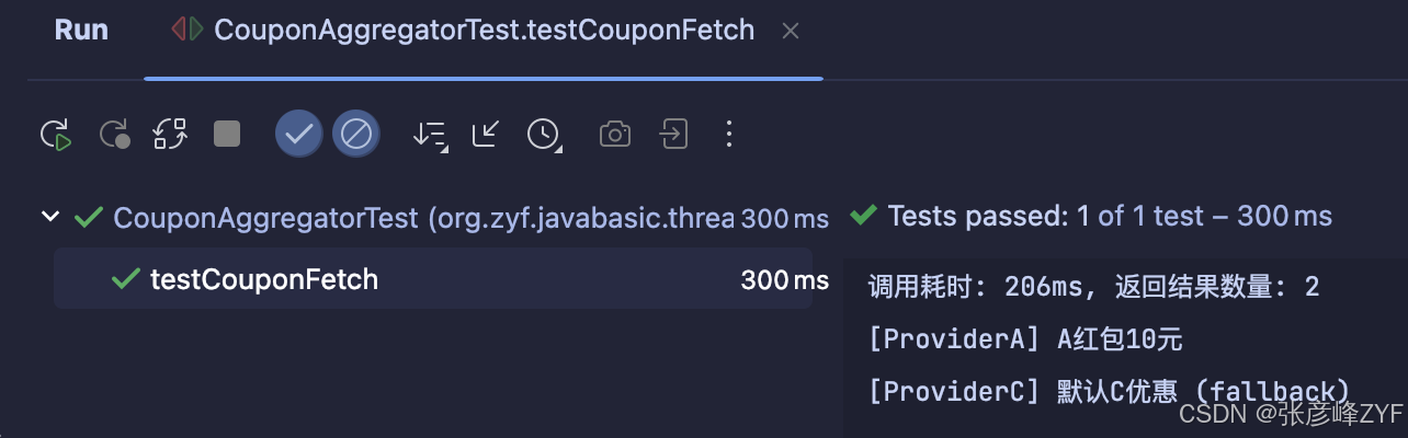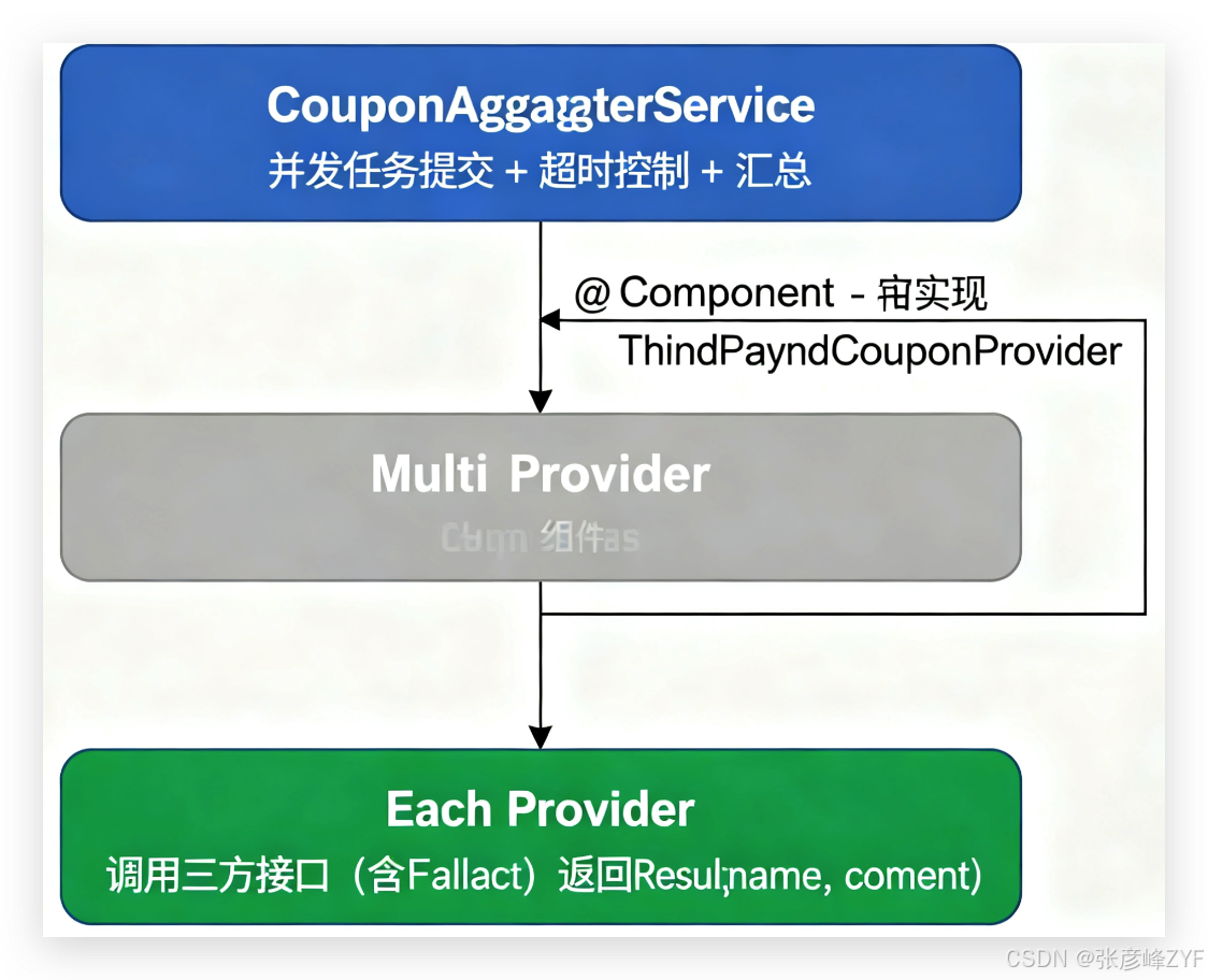 public class ProviderC implements ThirdPartyCouponProvider {@Overridepublic String getName() { return "ProviderC"; }@Overridepublic CouponResult doRequest() throws Exception {throw new RuntimeException("第三方接口异常");}@Overridepublic CouponResult fallback() {return new CouponResult(getName(), "默认C优惠", true);}