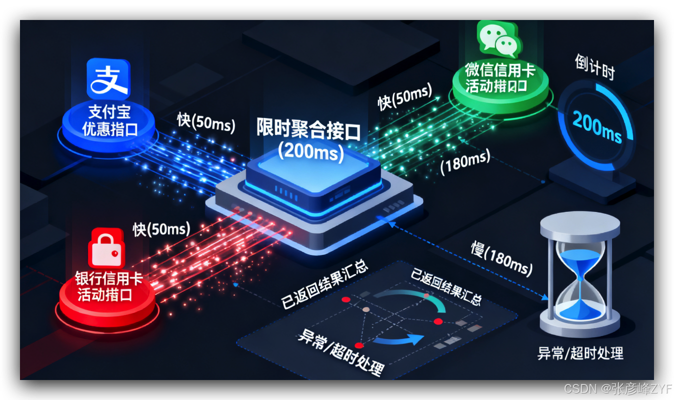 因此,我们需要一个 “限时聚合接口”,在 200ms 内并发调用所有三方服务,收集已返回的结果,并优雅地处理异常与超时。