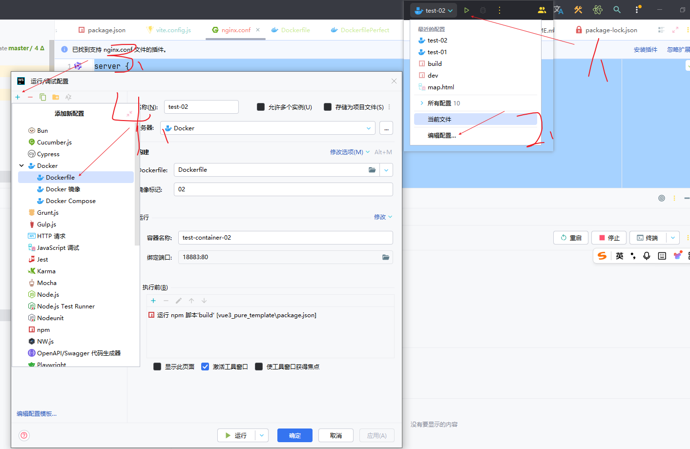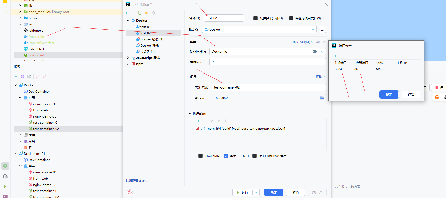 说明:创建和配置一个 Docker 运行/调试配置 的具体步骤。具体来说,这张图显示的是在“运行/调试配置”对话框中,用户正在创建一个名为 test-02的配置,其主要设置包括:使用 Dockerfile 来构建镜像,将镜像标签命名为 02,将容器名称设置为 test-container-02,并配置端口映射将主机的 18883 端口映射到容器的 80 端口,同时还在配置一个在容器运行前需要执行的 npm run build构建脚本。
