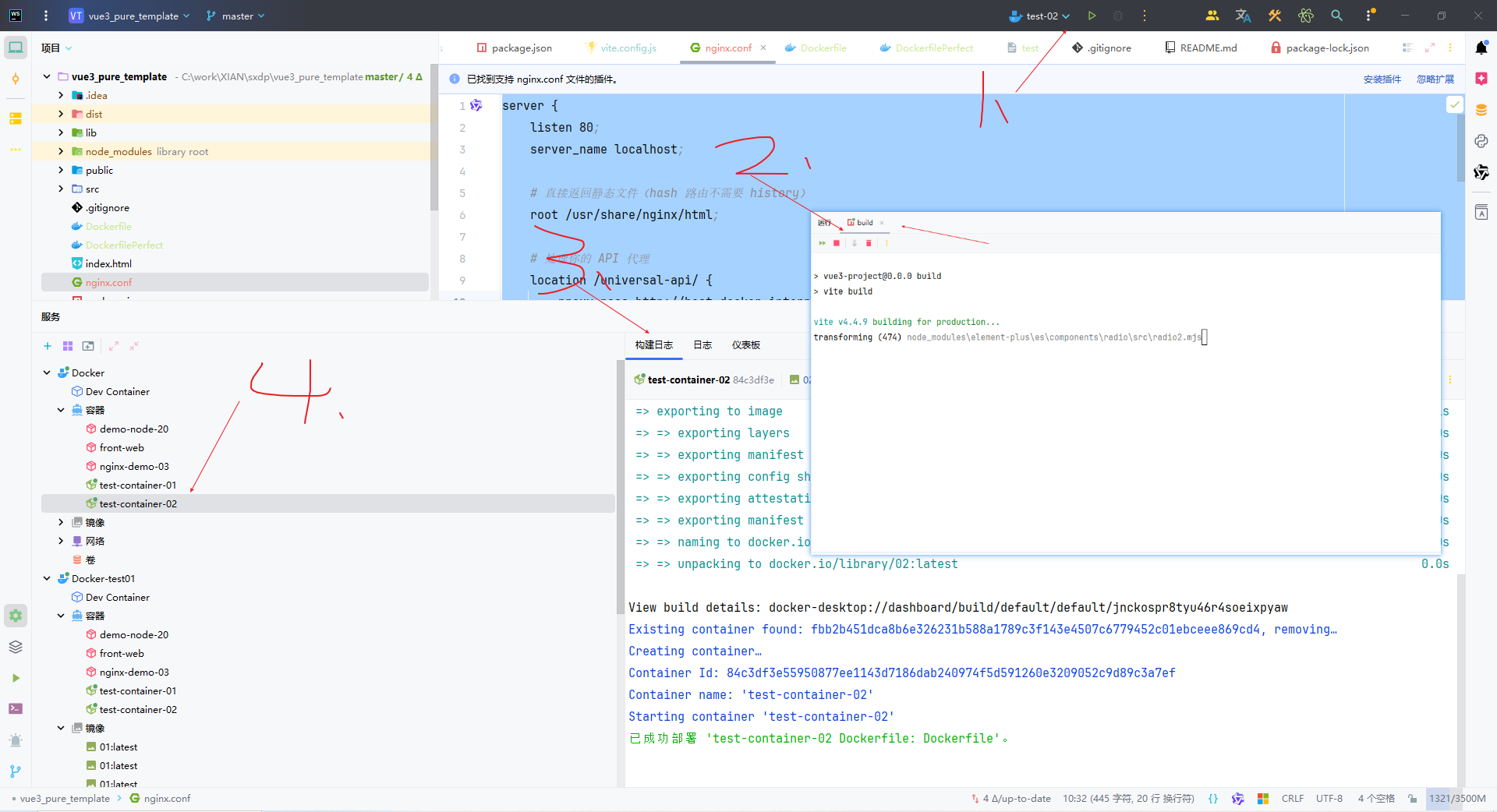 说明:Dockerfile 基于官方 Nginx 镜像,将自定义配置文件和前端打包产物拷贝到镜像中,并启动 Nginx 服务,监听 80 端口提供静态页面和代理功能。