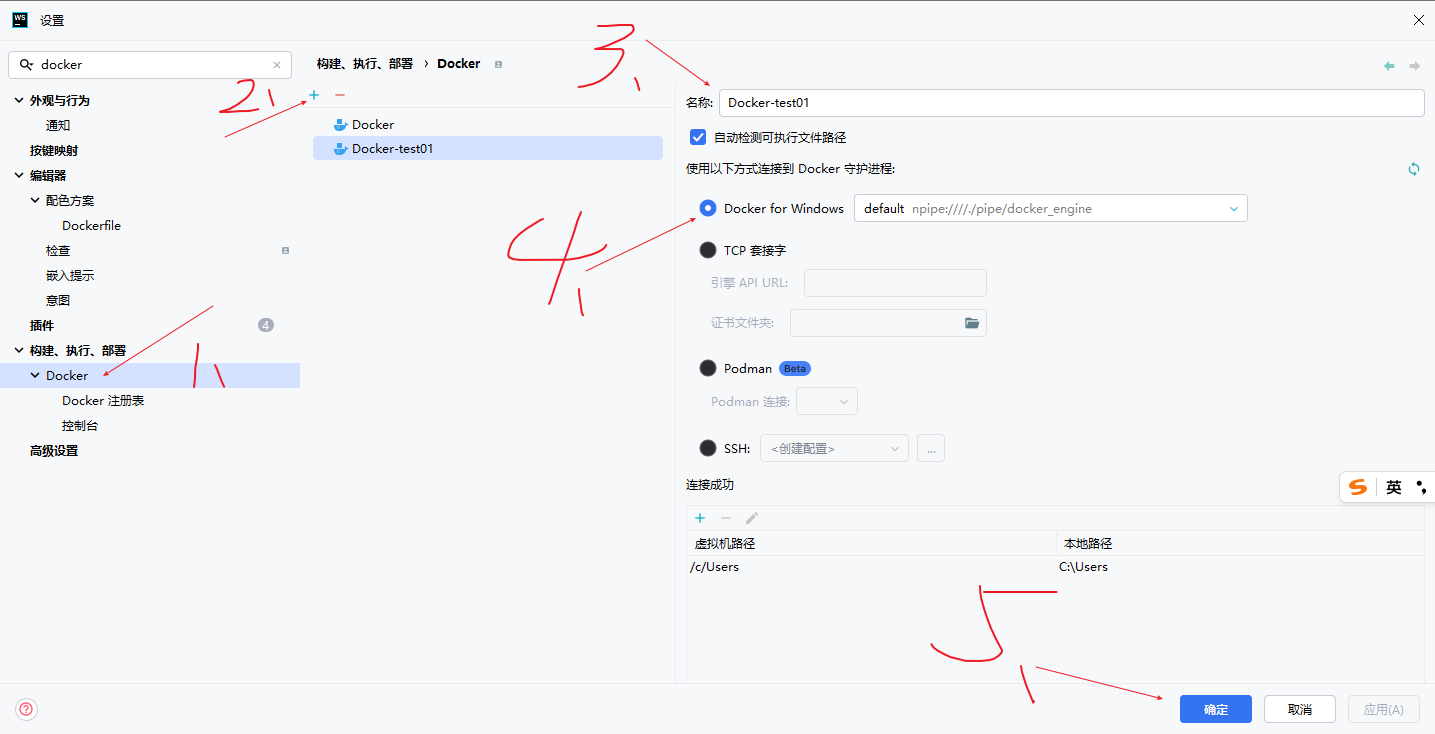 说明:在“设置”中,左侧菜单“构建、执行、部署”下已有“Docker”选项,右侧显示具体的连接配置面板。当前配置名称为“Docker-test01”,已成功使用“Docker for Windows”并通过命名管道连接到本地 Docker 守护进程,底部显示“连接成功”。在 Windows 环境下可直接使用命名管道连接;若是在远程服务器环境,应使用 TCP 套接字,并在“引擎 API URL”中填写服务器的 Docker 地址进行连接。
